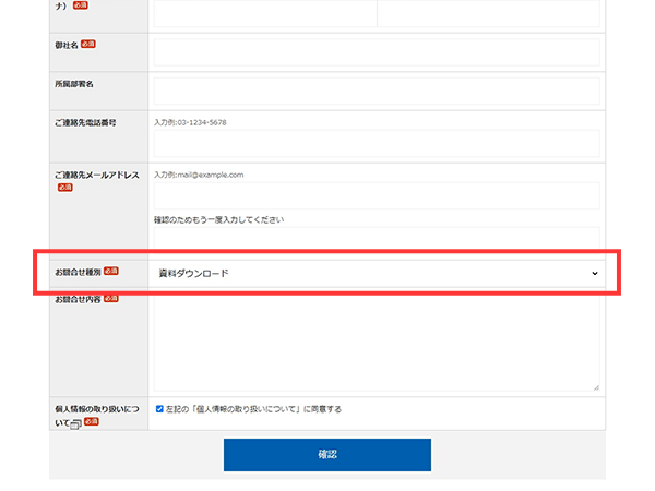 その際、「お問合せ種別」の項目では「資料ダウンロード」を選択してください。